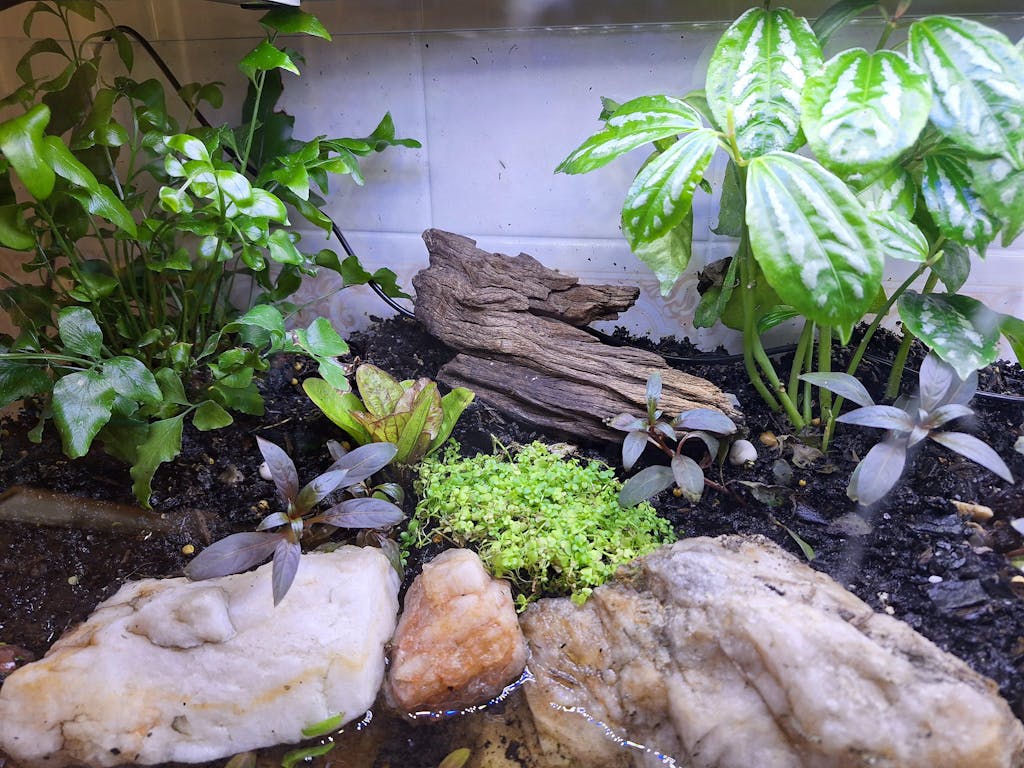 A pre-packed terrarium plant display box! This unique set features semi-aquatic plants that thrive in open air, ensuring they won’t wilt when transferred to a terrarium or paludarium.